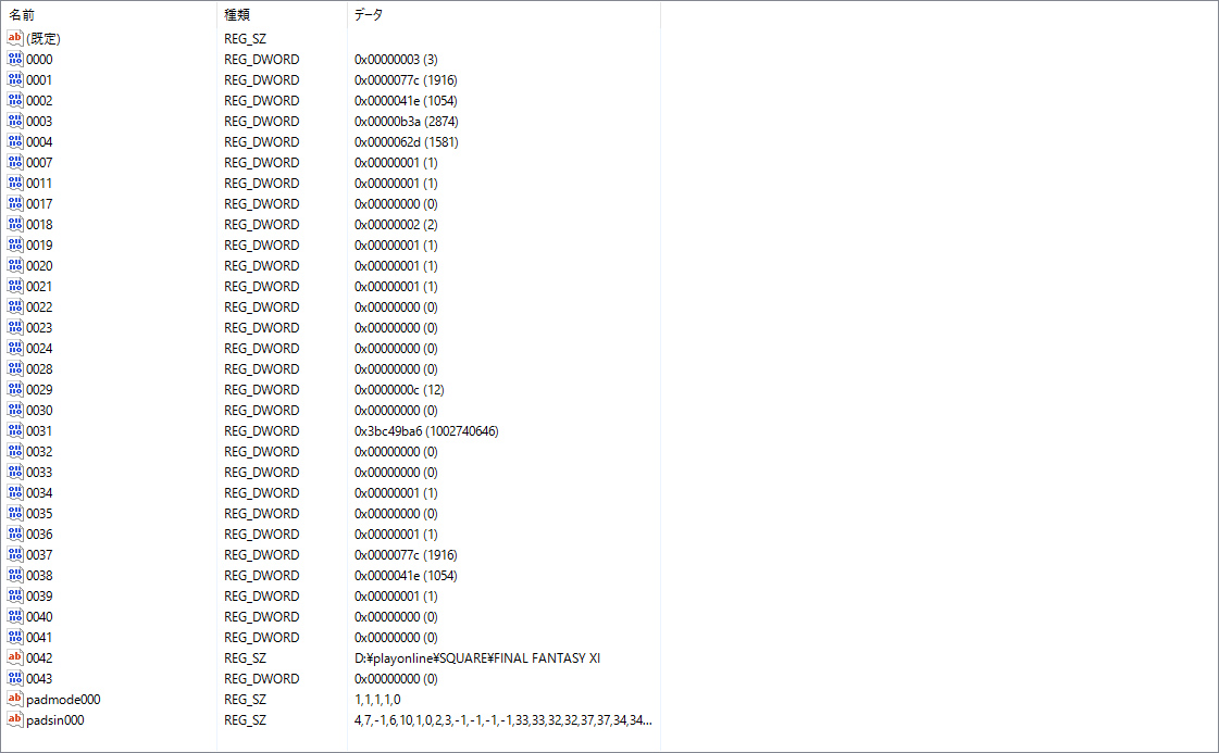 FF11の設定ファイルの場所ですが、「/HKEY_LOCAL_MACHINE/SOFTWARE/Wow6432Node/PlayOnline/Square/FinalFantasyXI」にあります。個人の環境によって場所は変わるかもしれません。